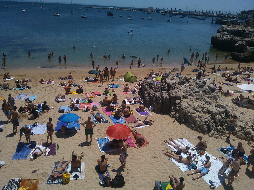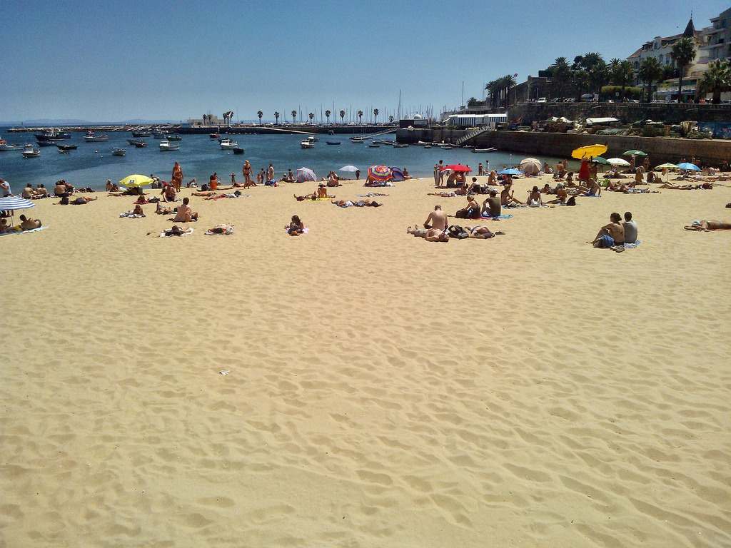 Φύγαμε απ'το ξενοδοχείο και πήραμε μετρό για το κέντρο και μετά τρένο για το Cascais.. Είχε αρκετή ουρά για να βγάλουμε εισιτήριο τρένου. Η ζεστή αυγουστιάτικη μέρα ήταν ιδανική για μπάνιο στη θάλασσα, και έτσι πολλοί είχαν την ίδια ιδέα με μας. Η διαδρομή ήταν ευχάριστη και χαζεύαμε έξω κυρίως όσο πλησιάζαμε και βλέπαμε ωραίες παραλίες.