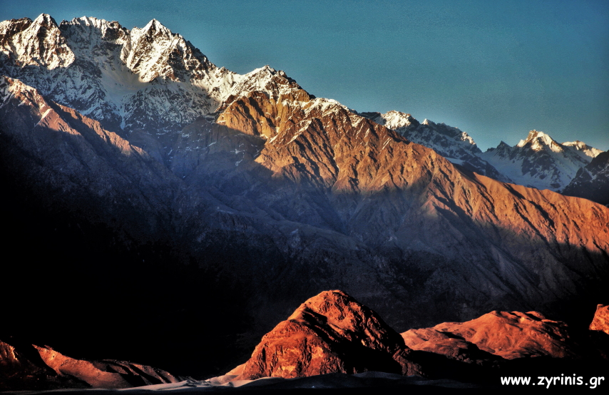 Τα Ιμαλάια το δειλινό από το ξενοδοχείο μας στο Σκαρντού (την ώρα που οι άντρες της παρέας αναπαύονταν στο δωμάτιο από τις συγκινήσεις της ημέρας, εγώ βάραγα υπεωρίες στον κήπο).