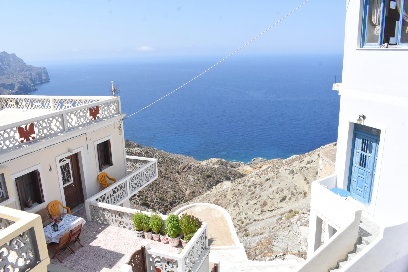 Εκεί βρίσκεται και το πιο γνωστό και πολυφωτογραφημένο μπαλκόνι του χωριού με άπλετη θέα προς τα Πηγάδια: