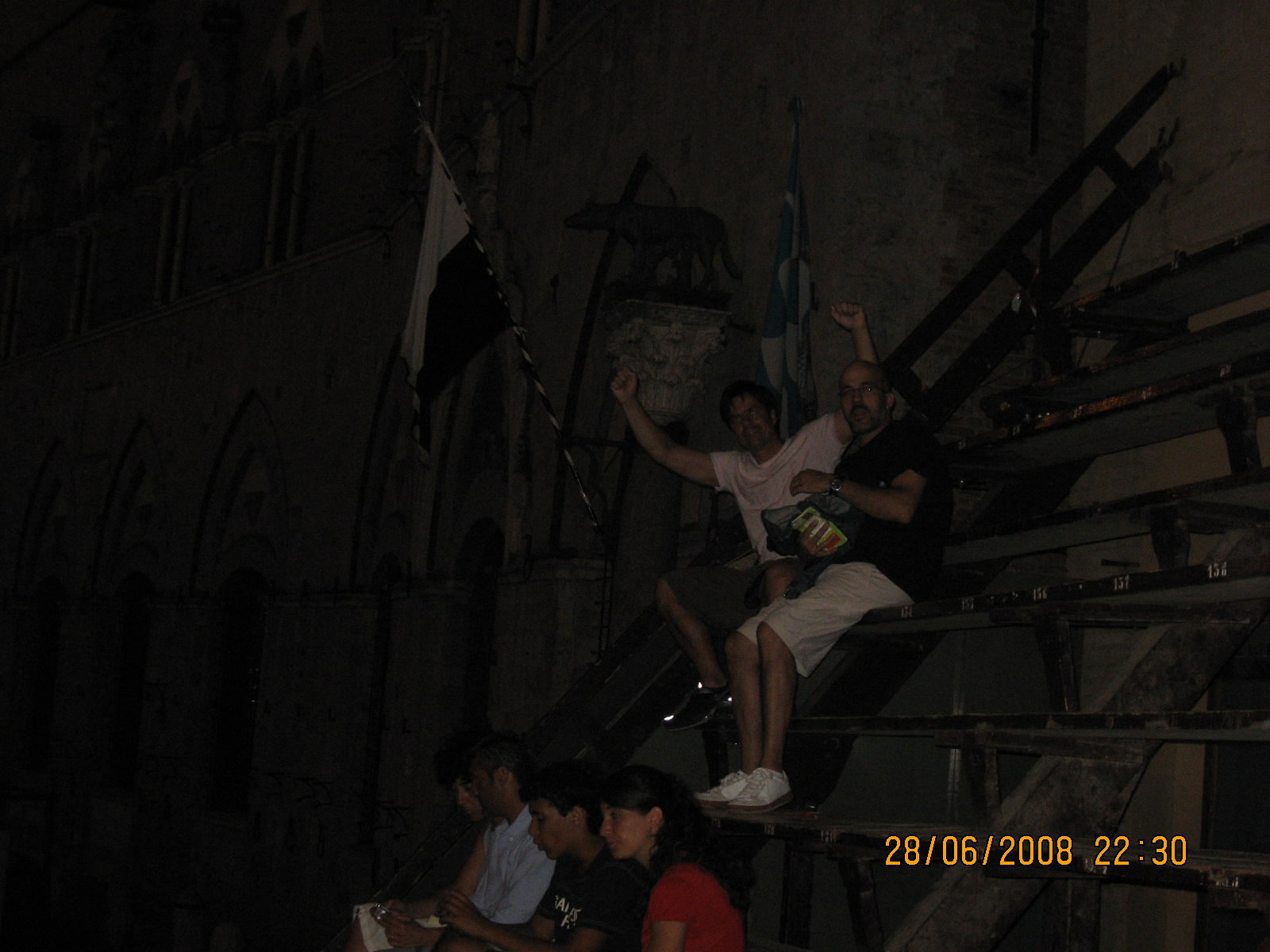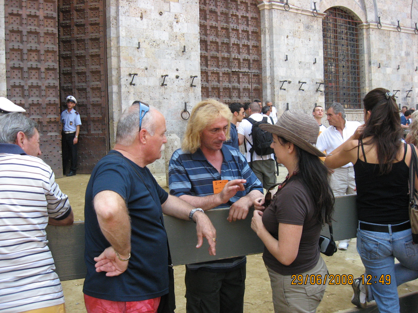 Στην πόρτα του Palazzo Pubblico στέκονταν κάποιοι ντόπιοι με διαπιστευτήρια κολλημένα στο στήθος τους. Είπα να κάνω την προσπάθειά μου και να τους πιάσω κουβέντα. Τώρα όταν λέω να τους πιάσω κουβέντα εννοώ να επικοινωνήσω μαζί τους όπως όπως και με χρήση παντομίμας, αφού Ιταλικά δεν ξέρω. Δεν δυσκολεύτηκα πολύ, αφού οι συγκεκριμένοι δύο ήταν πολύ εξωστρεφείς και … λαλίστατοι. Ο ένας, ο Mario ήταν πρώην αναβάτης. Είχε πάρει μέρος ως αναβάτης στο Palio της Σιένα την προηγούμενη δεκαετία. Τώρα ήταν ένας απλός contradaioli από μία contrada (που δεν θυμάμαι ποια μου είπε), που θα έτρεχε και στον τελικό της Τρίτης.