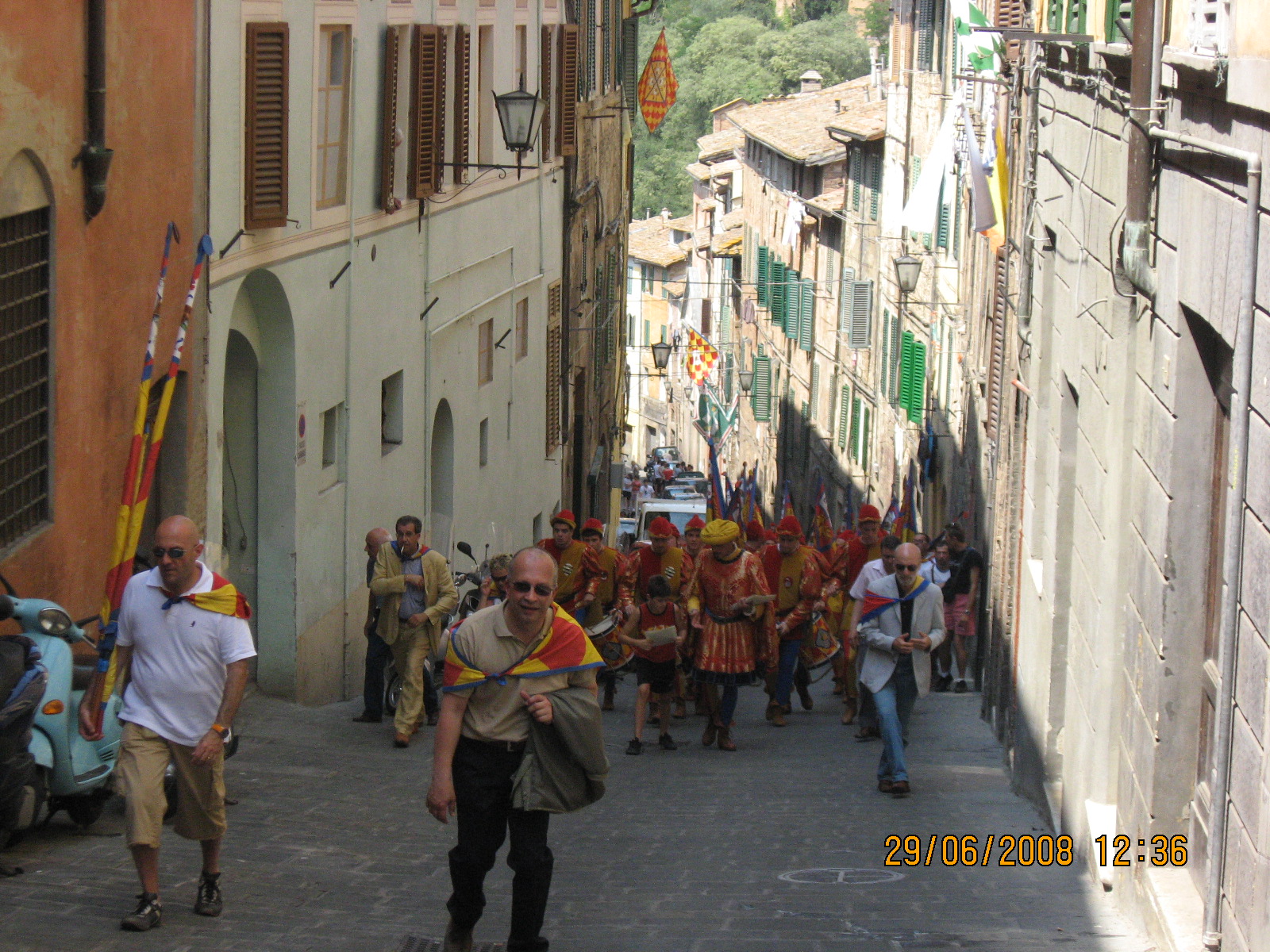 Με το που περάσαμε τα τείχη της πόλης πέσαμε πάνω σε μία πομπή μιας contrada. Η contrada του «σαλιγκαριού» ντυμένη με στολές εποχής (κάτι πορτοκαλοκόκκινες πολύ αστείες) με μπάντα, με τύμπανα περιδιάβαινε τους δρόμους. Τουρίστες και ντόπιοι μαζεύτηκαν γύρω της, με άλλοι να τη χειροκροτούν και άλλους να την ακολουθούν.
