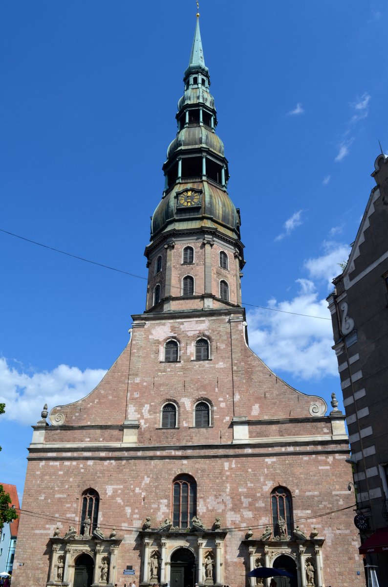 Η εκκλησία του Αγίου Πέτρου πρωτοκατασκευάστηκε το έτος 1209, ενώ τη σημερινή της μορφή έλαβε το έτος 1746. Πριν από τον δεύτερο παγκόσμιο πόλεμο, η Εκκλησία του Αγίου Πέτρου ήταν το ψηλότερο ξύλινο κτίριο της Ευρώπης. Το ύψος του γοτθικού ναού ανέρχεται στα 123 μέτρα. Κατά την διάρκεια του πολέμου η οροφή και ο πύργος υπέστησαν μεγάλες ζημιές από φωτιά και οι Σοβιετικοί μηχανικοί αποκατέστησαν την εκκλησία το 1973 και εγκατέστησαν έναν ανελκυστήρα. Τον ανελκυστήρα αυτόν ήθελα να εκμεταλλευτώ, ώστε να απολαύσω τη θέα της πόλης από ψηλά. Μπήκα μέσα στην εκκλησία, έβγαλα εισιτήριο το οποίο κόστιζε 9 ευρώ, ανέβηκα σκάλες ύψους περίπου έξι μέτρων, ο χρόνος αναμονής ήταν ελάχιστος, μπήκα στο ασανσέρ και ανεβήκαμε, μαζί με άλλους, στο καμπαναριό λίγο κάτω από την κορυφή του, αλλά το ύψος ήταν τέτοιο το οποίο εξασφάλιζε πανοραμική θέα της πόλης της Ρίγας.