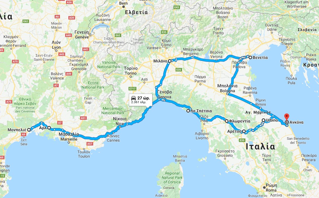 Τελικά καταλήξαμε σ’ ένα ταξίδι που θα περιελάβανε, την Ιταλική Τοσκάνη, τα κρεμαστά χωριά της θάλασσας της Λιγουρίας, τον Γαλλικό νότο μέχρι και την Montpellier και στη συνέχεια θα επισκεπτόμασταν τμήμα της Βόρειας Ιταλίας, με τελικό προορισμό τη ρομαντική Βενετία.