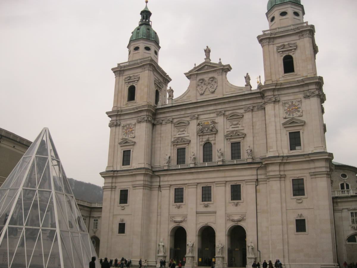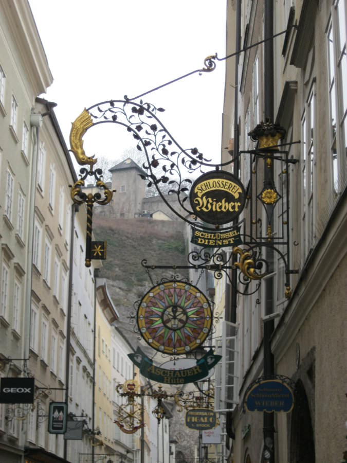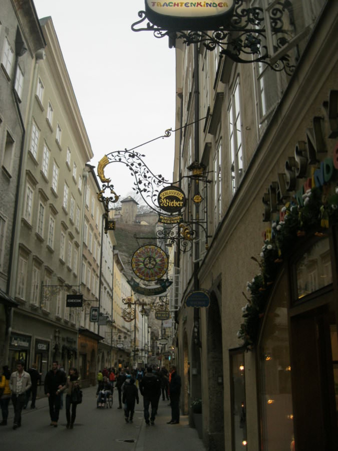 Συνεχίζουμε τη διαδρομή μας ,με εμφανή σημάδια πλέον του ουρανού, ότι σε λίγο θα ξεκινούσε να βρέχει! Αφού περνάμε ήρεμα τις διαβάσεις στους δρόμους,όπου οι Αυστριακοί όπως και οι περισσότεροι πολίτες στην Ευρώπη σταματάνε πολύ ευγενικά για να περάσουμε, μπαίνουμε στην παλιά πόλη του Salzburg και κατευθείαν μεταφερόμαστε σε άλλη εποχή,μερικούς αιώνες πίσω! Η Getreidegasse σφύζει από κόσμο που απολαμβάνει την βόλτα του και ψωνίζει στα μαγαζιά! Δυστυχώς ,παρόλο που δεν είχαμε χρόνο ,δεν μπορέσαμε να μην μπούμε και μεις σε μερικά ιδιαίτερα μαγαζιά που μας κάνανε εντύπωση! Το θέαμα με τις κρεμαστές πινακίδες δεξιά και αριστερά πραγματικά σε μαγεύει ,και σου καθορίζει από μόνο του τη διαδρομή που θα ακολουθήσεις! Περάσαμε μπροστά από το Mozart's Geburtshaus,το σπίτι όπου γεννήθηκε ο Mozart, το Cafe Mozart ,όπου μου έκανε φοβερή εντύπωση η είσοδος του ,καθώς και δεκάδες μαγαζάκια που πουλούσαν τα πασίγνωστα πλέον σοκολατάκια του Mozart (Γενικά ο τουρισμός του Salzburg όπως θα έχετε καταλάβει,περιστρέφεται γύρω από τον Mozart και σε μικρότερη κλίμακα στη Red Bull). Σε ένα στενάκι από τα πολλά κάθετα ,βρήκαμε μια λαϊκή αγορά που ετοιμαζόταν να κλείσει (λόγω ώρας ή λόγω διαφαινόμενης βροχής) και ένα stand που πουλούσε λουκάνικα ,μας πρόσφερε το πρώτο μας Frankfurter,καθώς είχαμε αρχίσει και να πεινάμε λίγο! Αφού γεμίσαμε δυνάμεις αρχίσαμε να κατευθυνόμαστε προς το φρούριο του Salzburg,περνώντας από την Residenz Platz,όπου δεκάδες άμαξες περίμεναν πελάτες για μια περιήγηση της πόλης, και ακριβώς δίπλα δέσποζε ο Καθεδρικός Ναός του Salzburg ,όπου κάναμε μια στάση να τον θαυμάσουμε εσωτερικά.