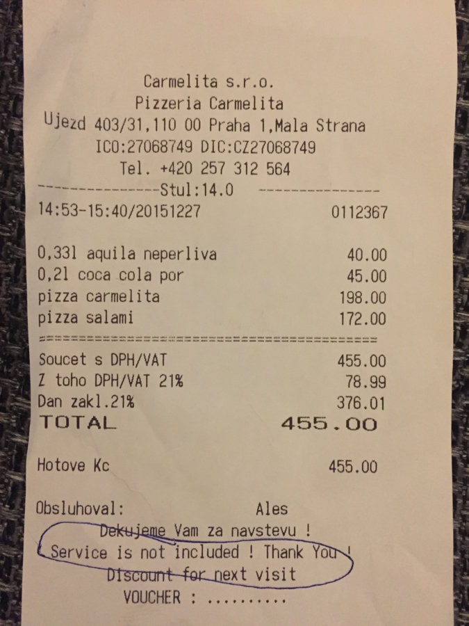 Να έχετε επίσης το νου σας με τα ρέστα που σας φέρνουν... Τα χαρτονομίσματα εξαφανίζονται ως δια μαγείας και σας φέρνουν πίσω μόνο μερικά ευτελούς αξίας, τσέχικα κέρματα! Επίσης φροντίζουν να απαιτούν με ιδιαίτερα άκομψο τρόπο το φιλοδώρημα, σημειώνοντάς το μάλιστα επάνω στην απόδειξη με στυλό: