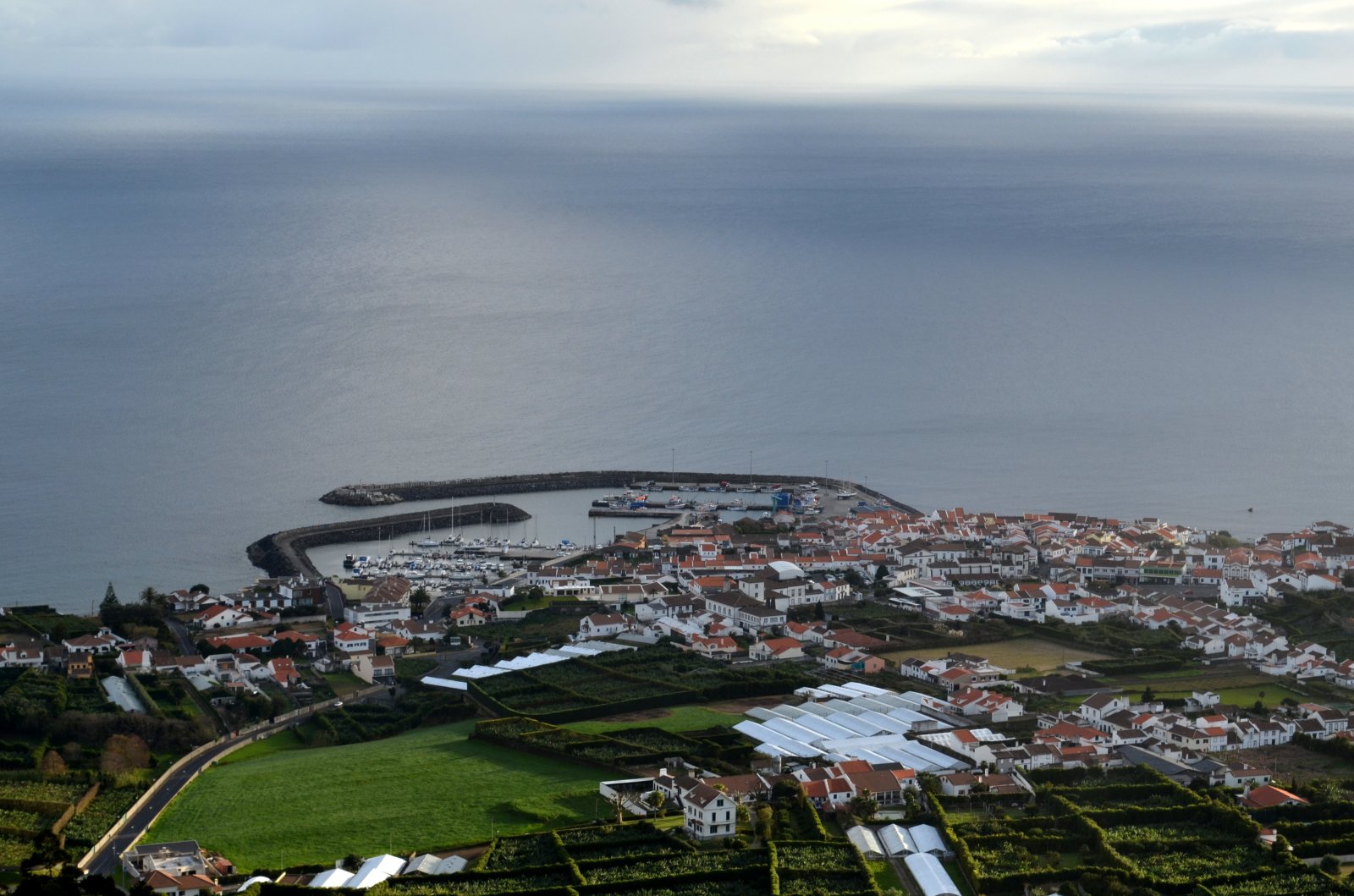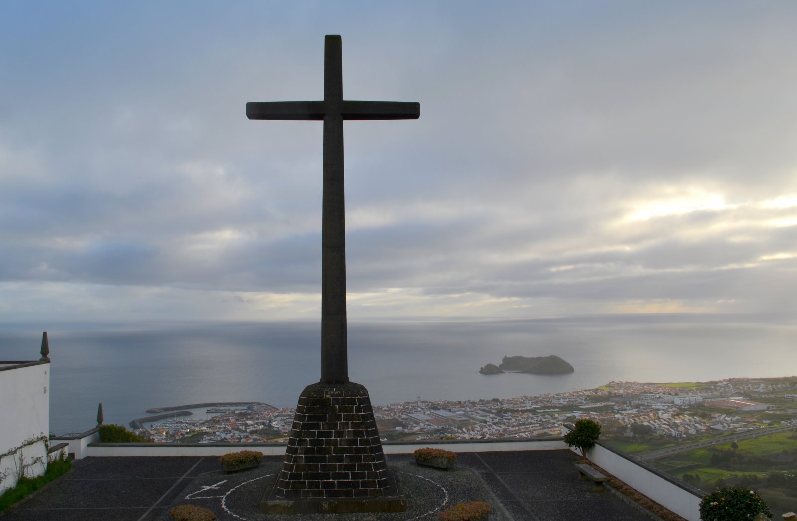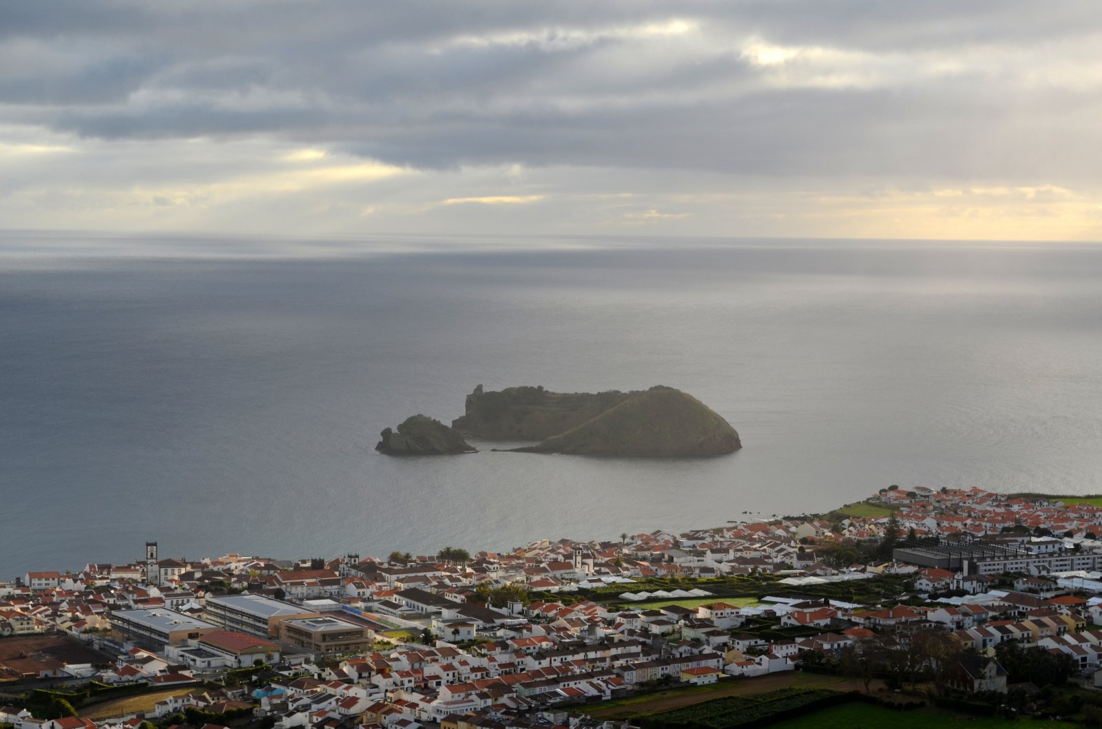 Αζόρες. Σάο Μιγκέλ. Θέα από την εκκλησία Οur lady of peace chapel προς την πόλη Vila Franca do Campo προς το λιμανάκι και προς το νησάκι Islet of Vila Franca do Campo.