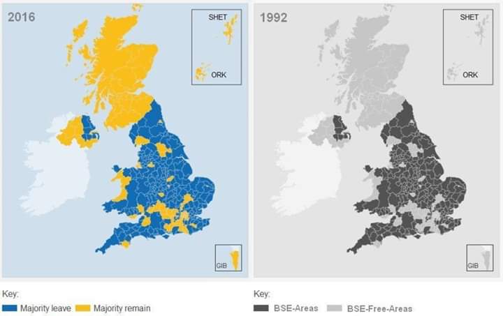Δεν θελω να μπω σε πολιτικη αντιπαραθεση αλλα αυτος ο χαρτης ειναι φυσικα fake news, ο αριστερα ειναι αυθεντικος παρμενος απο το αποτελεσμα του δημοψηφισματος του brexit ενω ο δεξια ειναι ψεμα, εχουν βαλει τον ιδιο απλα γυρισμενο σε ασπρο-μαυρο. Ισως καποιοι προσπαθουν να μας χειραγωγησουν, οτιδηποτε για να μην σπασει η γυαλα μας.Χαρτης των αποτελεσματων του δημοψηφισματος για το Brexit σε αντιπαραβολη με τον χαρτη των περιστατικων της νοσου των Τρελων Αγελαδων.