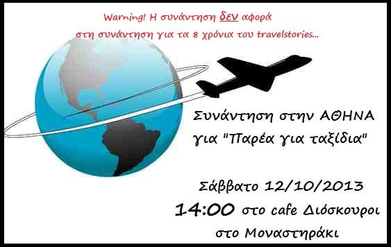 Μέχρι στιγμής δεν έχουμε κανονίσει για ταξίδι, αλλά για μια συνάντηση στην Αθήνα στις 12/10/2013 για να γνωριστούμε μεταξύ μας και να κανονίσουμε στη πορεία ταξίδια.Πολύ ωραίο και ενδιαφέρον θέμα!!!Κι εγώ έχω το ίδιο πρόβλημα να μη βρίσκω δηλαδή παρέα για ταξίδια... Είμαι φοιτήτρια και έχω την παρέα μου και πολύ καλούς φίλους, αλλά είναι πολύ δύσκολο να κανονίσουμε και να συμφωνήσουμε να πάμε όλοι μαζί ένα ταξίδι ακόμη και μέχρι τη Σκιάθο λόγω οικονομικών και δουλειάς και εννιότε και λόγω εξεταστικών ή καταλήψεων...