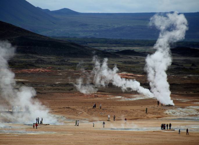 Τρεις λέξεις που εμφανίζονται συχνά ως συνθετικά τοπωνυμίων σηματοδοτούν την ύπαρξη γεωθερμικής δραστηριότητας σε μια περιοχή: Reyk, δηλαδή ατμίδες, Hver, ήτοι θερμή πηγή, Laugar, χλιαρό ή ζεστό μπάνιο. Τα βασικά γεωθερμικά πεδία της Ισλανδίας απαντώνται σ’ ένα άξονα που ακολουθεί μια πορεία από νοτιοδυτικά προς βορειοανατολικά και αντιστοιχεί χοντρικά στο ρήγμα μεταξύ της ευρωπαϊκής και της αμερικάνικης πλάκας που τέμνει τη χώρα. Στα νοτιοδυτικά του νησιού συναντάμε την χερσόνησο Reykjanes, την τοποθεσία Geysir όπου και ο πλέον γνωστός (και τουριστικός) υδατοπήδακας Stokkur, την κοιλάδα Reykholt, και το Landmannalaugar με τα πολύχρωμα βουνά από ρυολίτη. Στο κέντρο, Kjolur, Hveravellir, Kerlingarfjollσυνθέτουν το πλέον δυσπρόσιτο και γι αυτό άκρως γοητευτικό γεωθερμικό τρίπτυχο. Όσο για το βορειοανατολικό τμήμα, όλη η περιοχή στα πέριξ της λίμνης Myvatnδεν είναι παρά μια τεράστια χύτρα σε μόνιμη κατάσταση βρασμού: Bjarnarflag, Namaskard, Hverir, Krafla. Από πού ν’ αρχίσεις κι από πού να τελειώσεις…