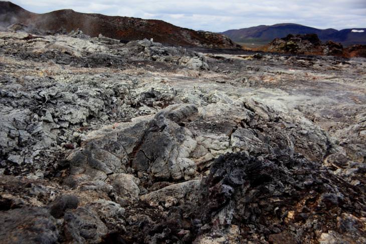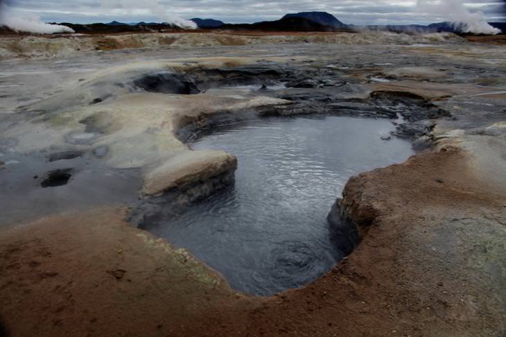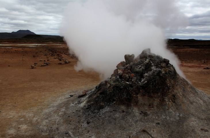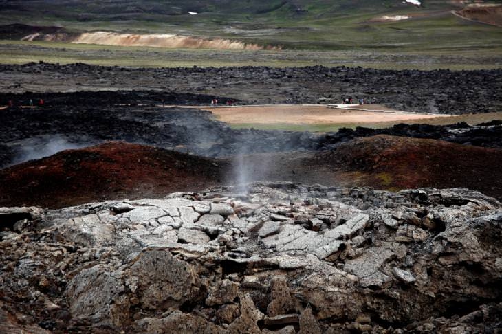 Με φόντο την παστέλ πορτοκαλί πλαγιά του Namasfjall, διάτρητη κι αυτή από σποραδικές θειούχες ατμίδες που κατατρώνε και αποσυνθέτουν σιγά σιγά το χώμα της, η πεδιάδα από κάτω τελεί σε μόνιμη κατάσταση βρασμού, διάσπαρτη από φυσικά καζάνια γαλαζωπής λάσπης, που θερμαίνει ασταμάτητα η καυτερή ανάσα της Γης, βγαλμένη από τα έγκατά της – ένα χιλιόμετρο κάτω από την επιφάνεια, η θερμοκρασία υπολογίζεται στους διακόσιους βαθμούς κελσίου.