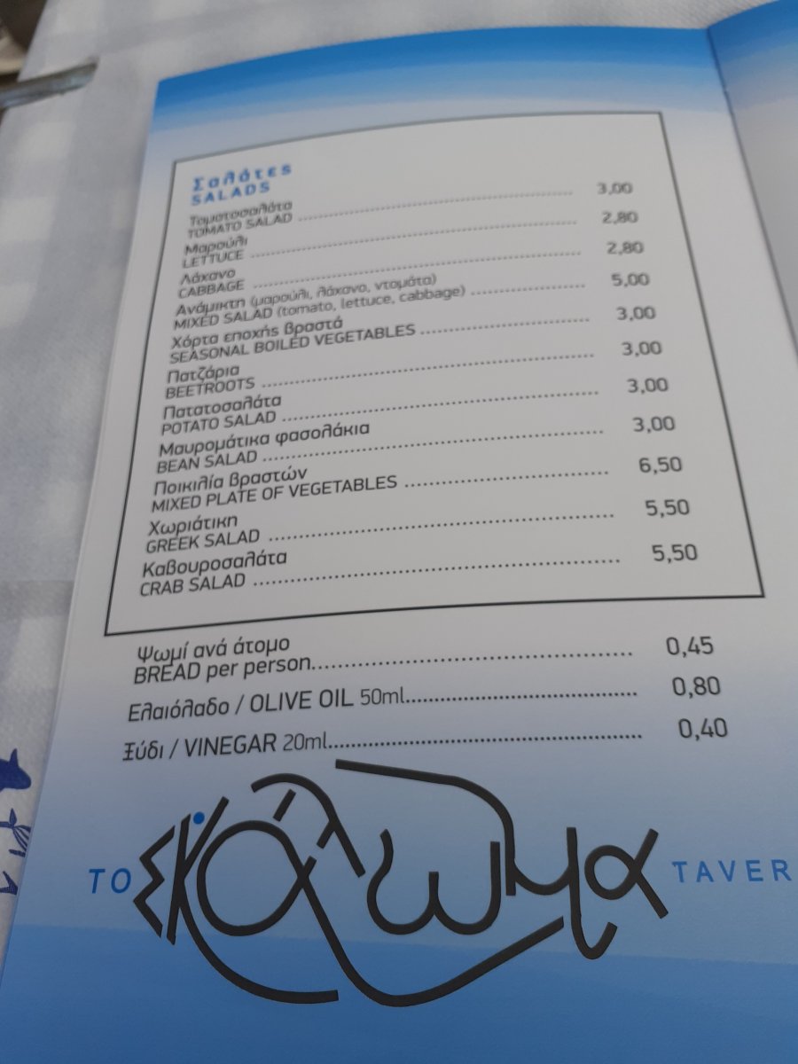 Τον νόμο που ανέφερες τον ξέρω και έχω κουβεντιάσει γι'αυτόν με πολλούς επαγελματίες του κλάδου.Μου έχουν πει ότι είναι ένα κόστος το οποίο καλούνται είτε να το απορροφήσουν είτε να το μετακυλήσουν στους πελάτες τους,χωρίς το τελευταίο όμως να είναι, όπως λες και εσύ, υποχρεωτικό.Οι περισσότεροι από την εμπειρία μου δεν το χρεώνουν και δεν το αναγράφουν στον κατάλογο.Δεν νομίζω όμως ότι ο νόμος λέει κάτι αντίστοιχο και για το ξύδι,οπότε θεωρώ παράλογο να πληρώσω έστω και 40 λεπτά για κάτι που ο ίδιος νόμος λέει ότι πρέπει μαζί με το λάδι και/ή το λεμόνι να υπάρχουν σε κανονικές ποσότητες στις σαλάτες,χόρτα,παντζάρια κλπΈχεις δίκιο για τον συνωστισμό μετά την δύση του ηλίου αν κι εμείς αρχές Ιουλίου που πήγαμε δεν περιμέναμε πολύ ώρα για να μας σερβίρουν. Σχετικά με την χρέωση του λαδόξυδου που αναφέρεις είναι νόμος από 1/1/2018 για όλα τα καταστήματα εστίασης.
