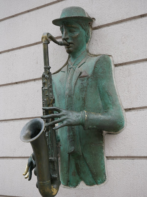 Σε προσοψη κτιρίου το Sculpture the Saxophone Player, διασκεδαστική και απροσδόκητη η γλυπτική του Σαξοφωνίστα.