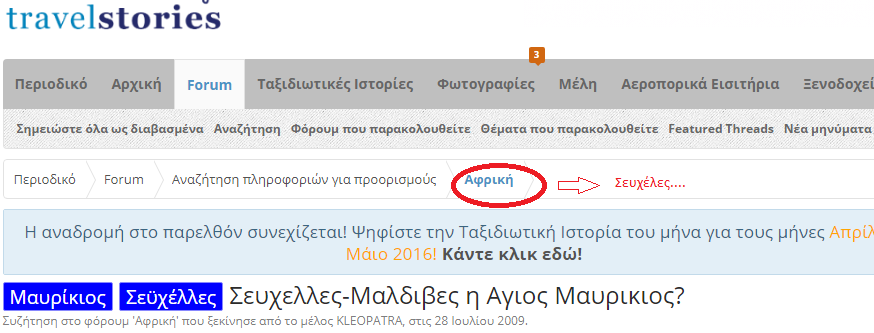 Μήπως απλά αντί να κάνεις κλικ στο θέμα να κάνεις δεξί κλικ > άνοιγμα σε νέο παράθυρο; έτσι κρατάς τα αποτελέσματα της αναζήτησης στο υφιστάμενο παράθυρο.@tkaramp τωρα που ξεθαψες το θέμα ας κάνω και εγω μια πρόταση!!! Όταν κάνω "Αναζήτηση πληροφοριών" για ενα προορισμο π.χ. Αφρική- Σεϊχέλες. Βρισκω 14 θεμετα - Ανοίγω το θέμα - Μαυρίκιος / Σεϋχέλλες / Μπαλι τον Ιούλιο για γαμήλιο. Το οποίο έχει μέσα 3 σελίδες γραφόμενα -το διαβάζω και μετά δεν υπάρχει τρόπος να ξαναπάω στην προηγούμενη αναζήτηση μου για Σευχέλες αφού η διαδρομή σταματάει στο Αφρική. Υπάρχει τρόπος να προστεθεί και το τελευταίο βημα της αναζήτησης και να σταματάει στη χώρα???? Για παραδειγμα κάπως έτσι... View attachment 282900