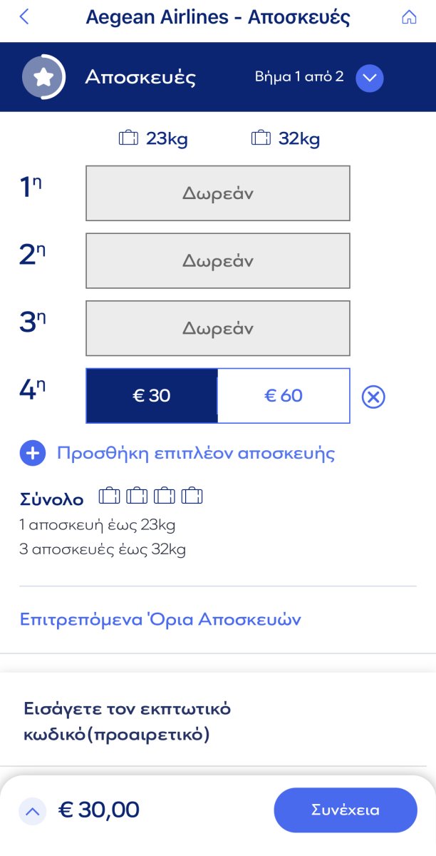 Είναι μια διαδρομή που έχω κάνει στο αντίστροφο. Αν η κράτηση είνα ενιαία έχεις τις αποσκευές που ορίζει η συμμαχία ανά κατηγορία. 1Χ23 κιλά οικονομική 2Χ32 κιλά διακεκριμένη άσχετα τι γράφει στην ιστοσελίδα της αιγαίου.