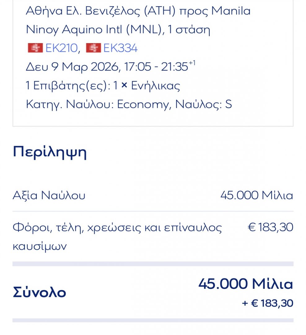 Να αναφερεις ομως πότε και σε τι θεση. Η business τους ειναι, ή ετσι τη θεωρουν, premium προιον κ πληρωνεται αναλογα. Η εκονομυ με 45.000 μιλια κ 183€ φορους φαινεται λογικη.