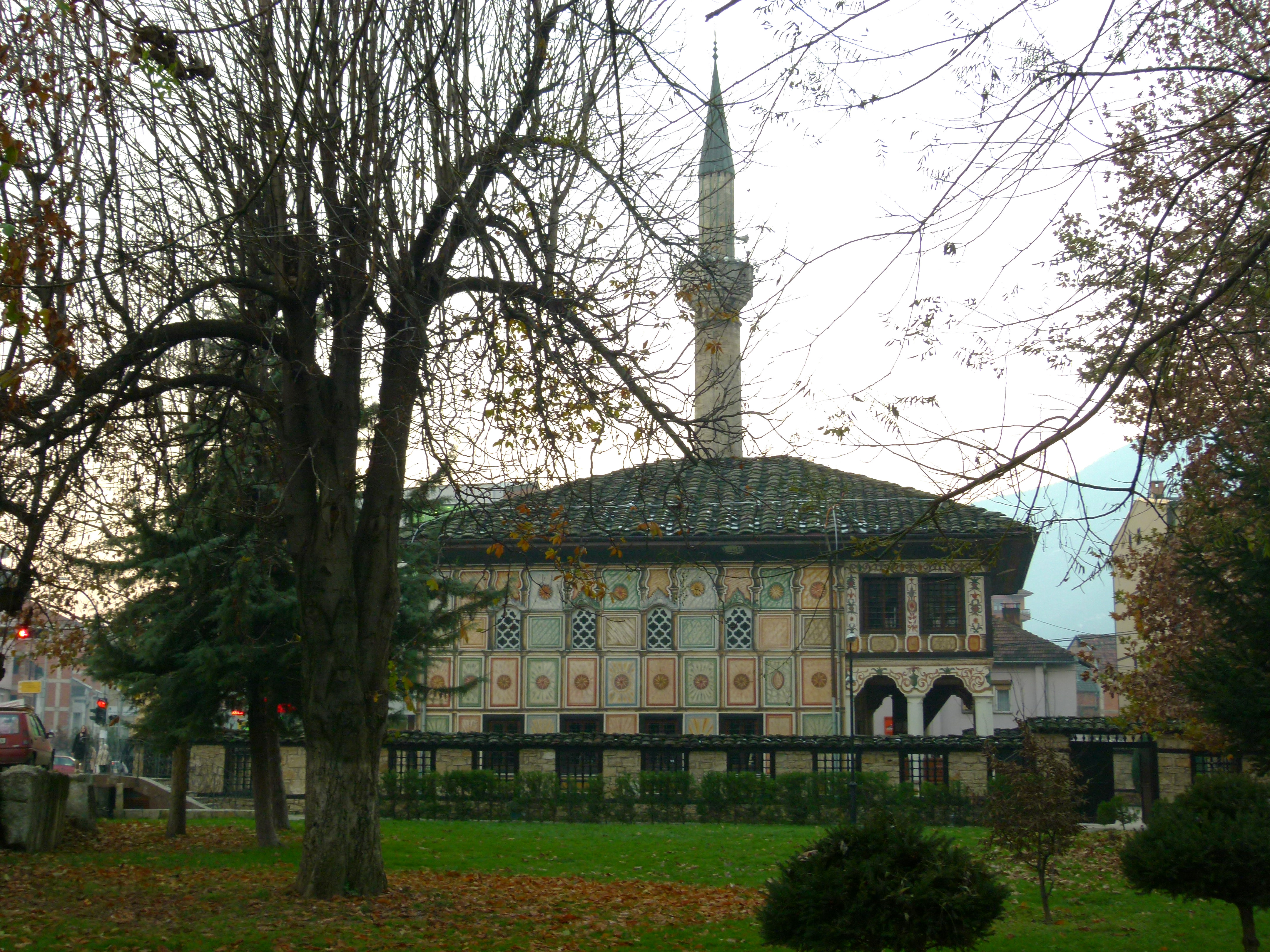 Εν συνέχεια κατευθυνθήκαμε προς το κέντρο της πόλης και συγκεκριμένα προς το Χρωματιστό Τζαμί (Sarena Dzamija). Χτίστηκε αρχικά το 1436, ενώ πήρε την τελική του μορφή το 1833, επί Αμπντουραχμάν Πασά. Είναι πολύ ιδιαίτερο, καθώς είναι όλο (εξωτερικά και εσωτερικά) χρωματισμένο με ποικίλα μοτίβα και διαφορετικούς συνδυασμούς. Επίσης, σε αντίθεση με τα περισσότερα Οθωμανικά τζαμιά, δεν έχει τον χαρακτηριστικό εξωτερικό θόλο. Η απλή του αρχιτεκτονική φαίνεται να ισορροπεί με τα έντονα χρώματά του, δημιουργώντας πάντως εν τέλει ένα ιδιαίτερα εντυπωσιακό αποτέλεσμα.