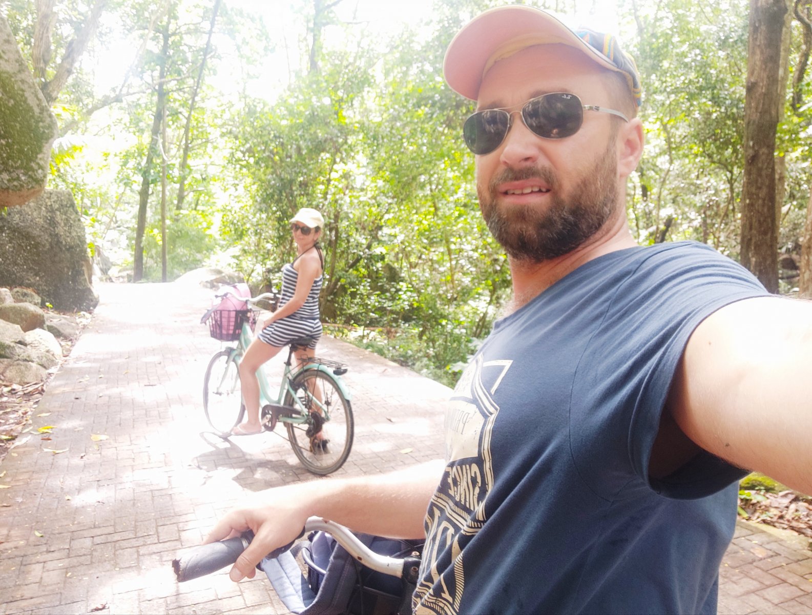 Ανεβήκαμε στα ποδήλατα και αφού διασχίσαμε τον δρόμο μέσα από την πυκνή ζούγκλα, σε περίπου 20 λεπτά φτάσαμε στην άλλη άκρη του νησιού.