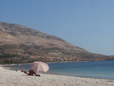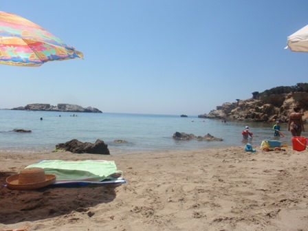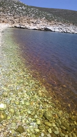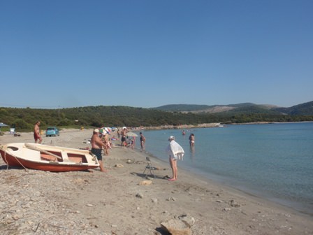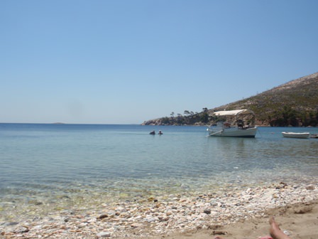 Φέτος όμως πήγα από δω, πήγα από εκεί, κατέβηκα σε κάτι χωματόδρομους, κατέληξα σε στάνη, ξαναγύρισα στον κεντρικό και το πήρα απόφαση...άνοιξα ένα συρμάτινο πορτονάκι που φαίνεται από τον δρόμο και ήταν φανερό ότι από εκεί κατέβαινες Κολυμπάδα (απαράδεκτη, το ξέρω) και κατηφόρισα. Μετά από ένα μικρό δύσκολο κομμάτι για συμβατικό ΙΧ κατεβαίνεις μια χαρά στην πεντακάθαρη αυτή θάλασσα, η οποία με αποζημίωσε για την παράνομη πράξη μου. Προφανώς ο δρόμος από τον οποίο περνάμε για να φτάσουμε είναι ιδιωτικός. Το πορτονάκι το έκλεισα αμέσως πάντως! Για τέτοιες παραλίες είναι φτιαγμένα τα γυαλάκια θάλασσας! Νερά κρυστάλλινα, δροσερά (δυστυχώς όχι αρκετά..), σούπερ, με πλάκες μεν κάτω αλλά από πάνω είχε χαλίκι οπότε δεν ήταν ενοχλητικές! Και σχεδόν όλη δική μας. Δυο Γάλλοι αριστερά, δυο Έλληνες δεξιά και εμείς. Α και ο κύριος στον οποίο ανήκει το σπίτι που είναι στην παραλία μπροστά και χάρη σε αυτόν είχαμε και ίσκιο (από τα δέντρα του κήπου του που έφταναν ως την άκρη της θάλασσας!)