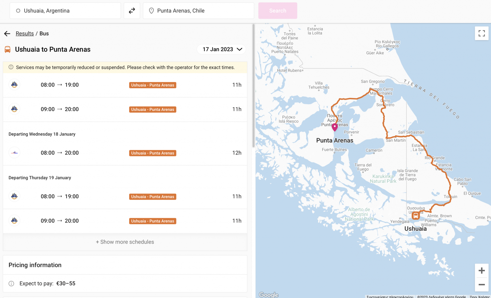 τον χειμώνα τους (Αύγουστο) πρέπει να έχει μεγάλες χιονοπτώσεις εκεί κάτω. πόσο ρίσκο παίρνουμε να πάμε με λεωφορείο από ουσουαια σε πουντα αρένας; το λεωφορείο χρειάζεται 12 ώρες περίπου.