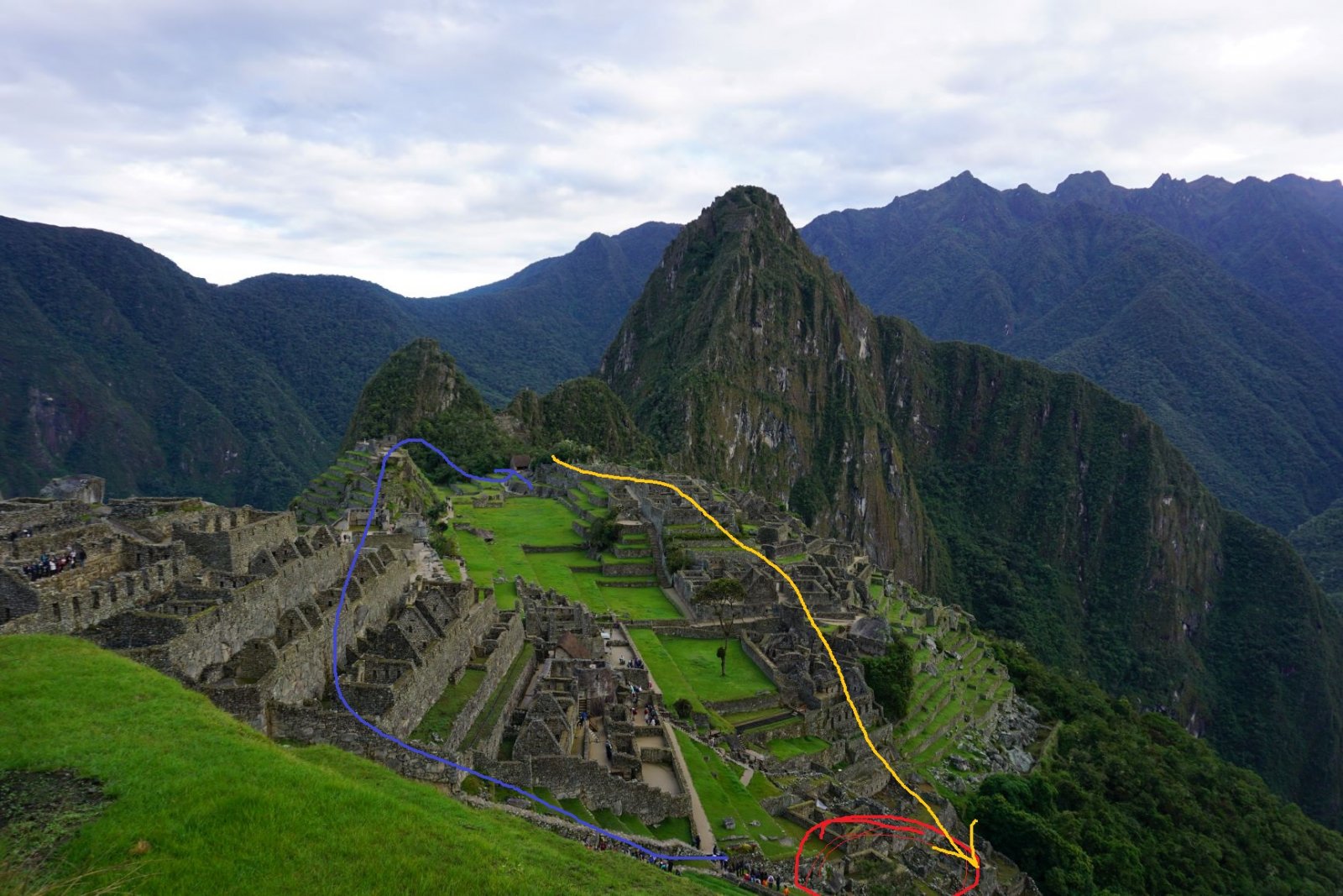 Στην παρακάτω φώτο, κάτω δεξιά που έχω βάλει τον κόκκινο κύκλο είναι η είσοδος στον αρχαιολογικό χώρο. Πρίν δύο χρόνια ήμασταν υποχρεωμένοι να ακολουθήσουμε σηματοδοτημένο μονοπάτι σύμφωνα με τη φορά του ρολογιού, δλδ μπορούσες να ακολουθήσεις το μπλέ βέλος στη φώτο. Εκεί που καταλήγει το μπλέ βέλος είναι η είσοδος στο Ουάινα Πίκτσου. Αυτό νομίζω δεν έχει αλλάξει ακόμα, όπως και το γεγονός οτι δεν επιτρέπεται να κάνεις πισωγυρίσματα, κάτι που δεν γνώριζα εγώ τότε και αναγκάστηκα να δείξω στο φύλακα που μου έκλεινε το μονοπάτι οτι έχω εισιτήριο για το Ουάινα Πίκτσου και τελικά με άφησε να γυρίσω πίσω (είχα φτάσει κοντά στις "τρείς πόρτες").Η η είσοδος για το Wayana Picchu είναι μέσα στον αρχαιολογικό. Τα 'έχω αρκετά μπερδεμένα...