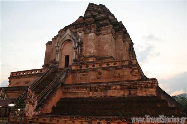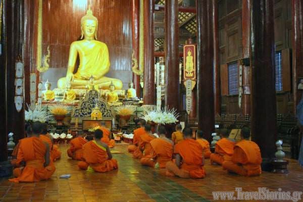 Για περισσότερο από μια ώρα περιπλανηθήκαμε στον υπέροχο ναό και στο προαύλιο του. Ο ναός χρονολογείται από το 1383 μ.χ και θεωρείται από τους Ταϊλανδούς ένας από τους πιο ιερούς της χώρας. Στο κέντρο υπάρχει μια εντυπωσιακή χρυσή στούπα και γύρω γύρω διαφορετικά παρεκκλήσια και περίτεχνα αγάλματα μεταξύ των οποίων και ένα αντίγραφο το Emerald Buddha (το πρωτότυπο βρίσκεται στο Μεγάλο Παλάτι στην Μπανγκόκ. Το εσωτερικό των παρεκκλησιών ήταν διακοσμημένο με τοιχογραφίες και αγάλματα, ενώ μοναχοί έδιναν την ευλογία τους στους πιστούς. Κάναμε το γύρω της στούπας με τη φορά των δεικτών του ρολογιού μαζί με τους πιστούς που απάγγελλαν προσευχές. Ο χώρος ήταν κατάμεστος από κόσμο και ήταν δύσκολο να τραβήξεις φωτογραφία χωρίς το κεφάλι κάποιου μέσα.