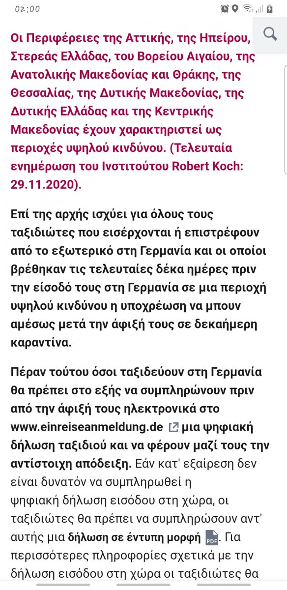 Από τις 29.11.2020 όλη η ηπειρωτική Ελλάδα, εκτός της Πελοποννήσου, θεωρούνται περιοχές υψηλού κινδύνου για την Γερμανία.