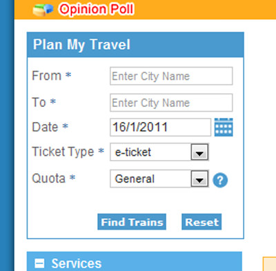 Αρχικα μπαινεις στη σελιδα Welcome to Indian Railway Passenger reservation Enquiry , επιλεγουμε internet reservation και προχωραμε στη δωρεαν εγγραφη. Μολις εισαγεις username και κωδικο προχωρας. Αρχικα εμφανιζεται αυτο...
