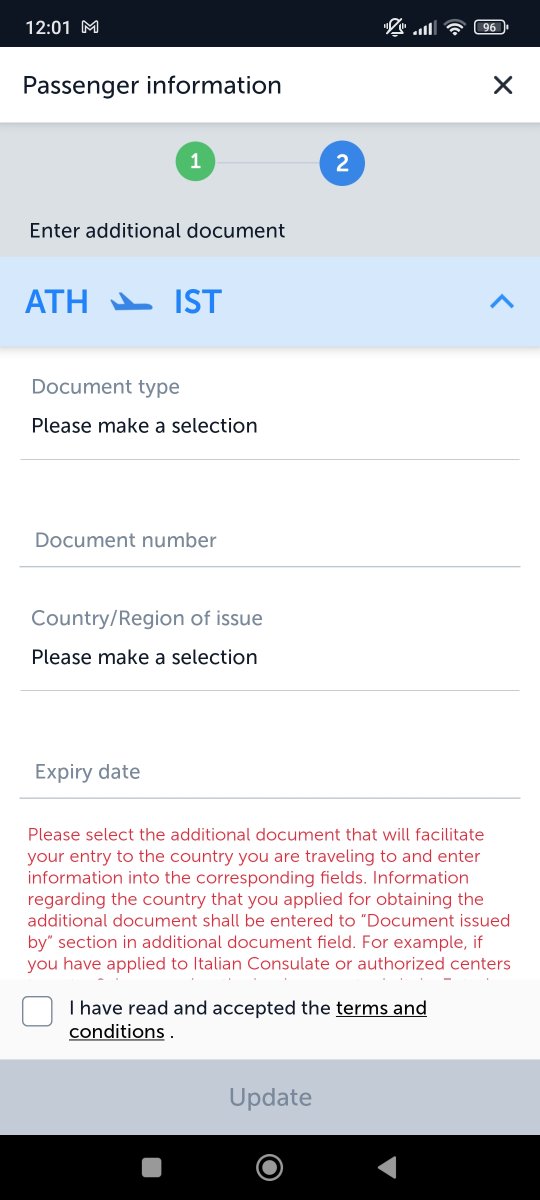 Καλημέρα, μπορεί κάποιος να με βοηθήσει με το check in μέσω της εφαρμογής της Turkish. Πάω Αμερική μέσω Κωνσταντινούπολης, αφού συμπληρώσω τα στοιχεία των διαβατηρίων μου ζητάει να δώσω στοιχεία της esta απ' ότι καταλαβαίνω. Στην πρώτη πτήση, προς Κωνσταντινούπολη επιλέγω visa ή Σένγκεν resident. Κυρίως θέλω μια βοήθεια σε αυτό το κομμάτι....