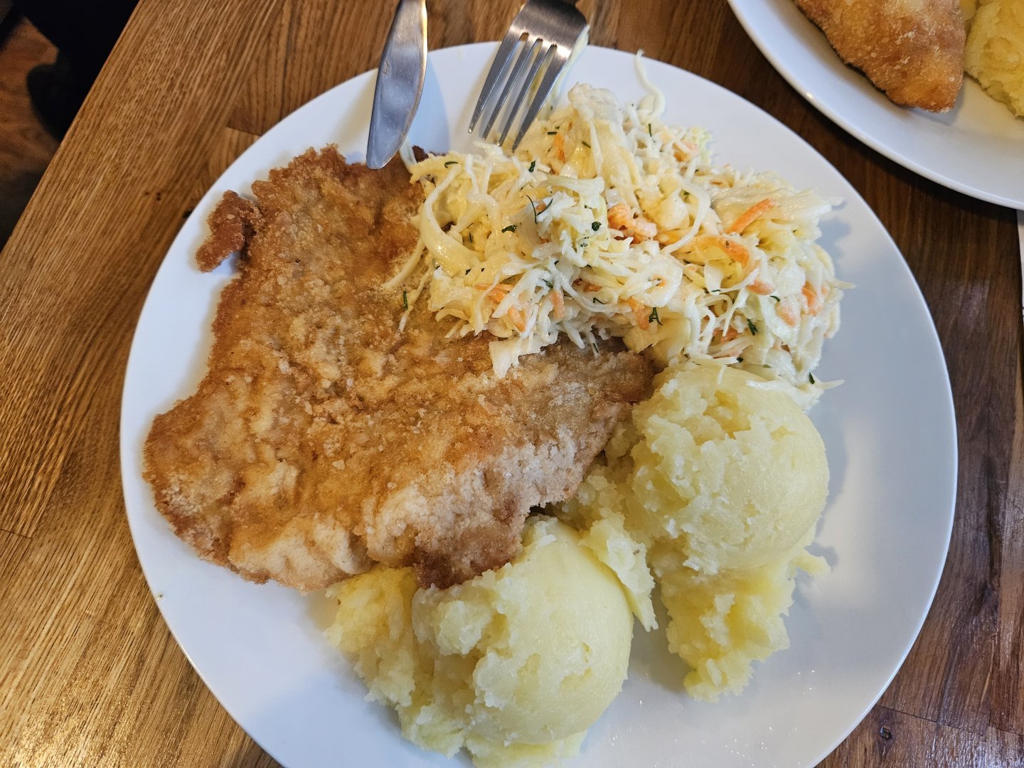 Το τρίτο και τελευταίο τοπικό πολωνικό εστιατόριο που δοκιμάσαμε (μετά φύγαμε αλλιώς θα τα είχαμε λιώσει). Ήταν σχεδόν ίδιο με το δεύτερο και παραγγείλαμε με τον ίδιο τρόπο όπως και στο δεύτερο και φάγαμε εξίσου πολύ καλά! Πήραμε χοιρινό κρέας σε σάλτσα μυρωδικών και παναρισμένο γεμιστό κοτόπουλο με μυρωδικά, συνοδευμένα με πουρέ πατάτας και σαλάτα της αρεσκείας μας View attachment 495896