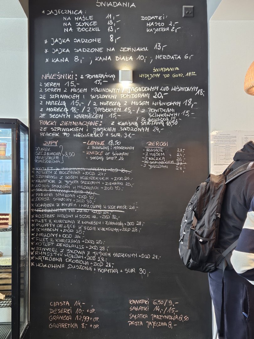 Όσο περιμέναμε τη σειρά μας δεν είδαμε πουθενά κάποιο παρόμοιο σύστημα παραγγελίας με αυτό που είχαμε δει στο προηγούμενο εστιατόριο. Αντιθέτως υπήρχε ένα μεγάλος μαυροπίνακας πάνω στον οποίο αναγράφονταν με κιμωλία όλο το μενού, μόνο στα Πολωνικά (!) και δίπλα απο κάθε πιάτο η τιμή του σε ζλότι.