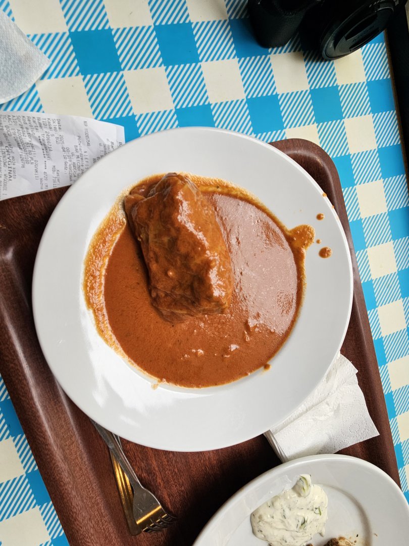 Πήραμε τρία πιάτα. Gołąbki που είναι λαχανοντολμάς με σάλτσα ντομάτας, στήθος κοτόπουλου στη σχάρα με σως τζατζικιού και placki ziemniaczane που είναι τηγανίτες πατάτας με τρία τυριά και σπανάκι