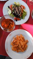 Πρώτο πιάτο σαλάτα η μακαρόνια μπολονεζ, δεύτερο ψάρι λαβράκι η πσεγιαυ και στο τέλος κρέμα Cataluña. 1 ποτήρι κρασί