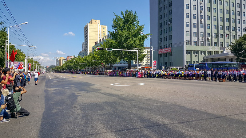 Παρκάραμε το πουλμανάκι σε προδιαγεγραμμένη θέση έξω από ένα ξενοδοχείο που όπως μάθαμε φιλοξενεί κι αυτό για πρώτη φορά γκρουπ δυτικών τουριστών, και προχωρήσαμε για να σταθούμε σε προκαθορισμένο σημείο πάνω στη λεωφόρο Chollima, περιμένοντας την παρέλαση να περάσει από εκεί.