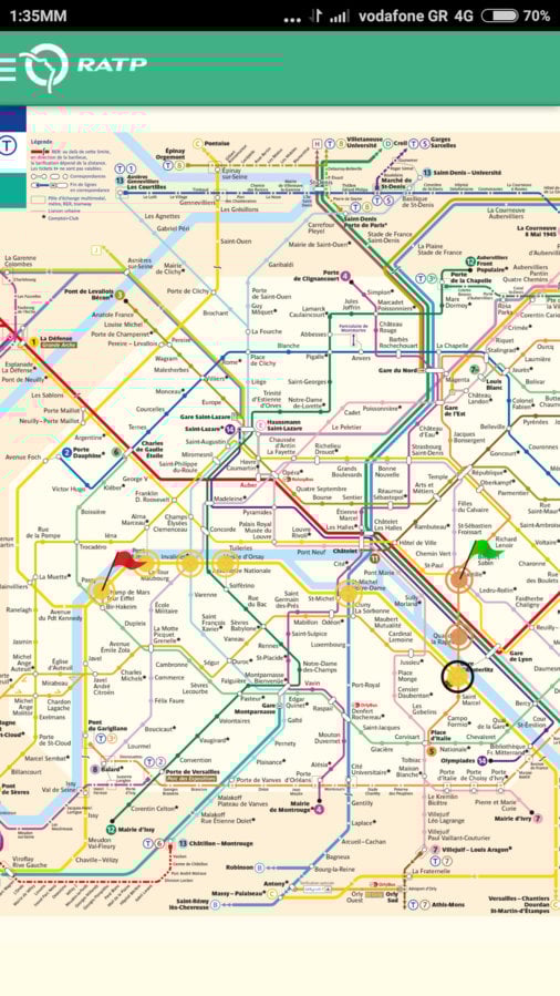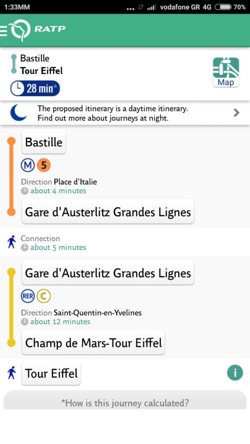 Κατεβάστε στο κινητό σας την εφαρμογή "Visit Paris by metro". Υπάρχει και για android και για iPhone και είναι δωρεάν. Αυτή η θαυματουργή εφαρμογή λοιπόν λειτουργεί χωρίς να χρειάζεται internet και είναι κάτι σαν το παραπάνω link μόνο που το έχει πάει ακόμα παραπέρα. Βάζετε αφετηρία και προορισμό και σας βγάζει τη διαδρομή, αλλά μπορείτε να βάλετε και attraction. Πχ, Eiffel Tower. Απο που θες να πας; Απο τη Βαστίλη;; Voilà.