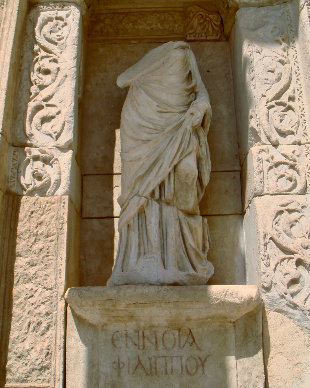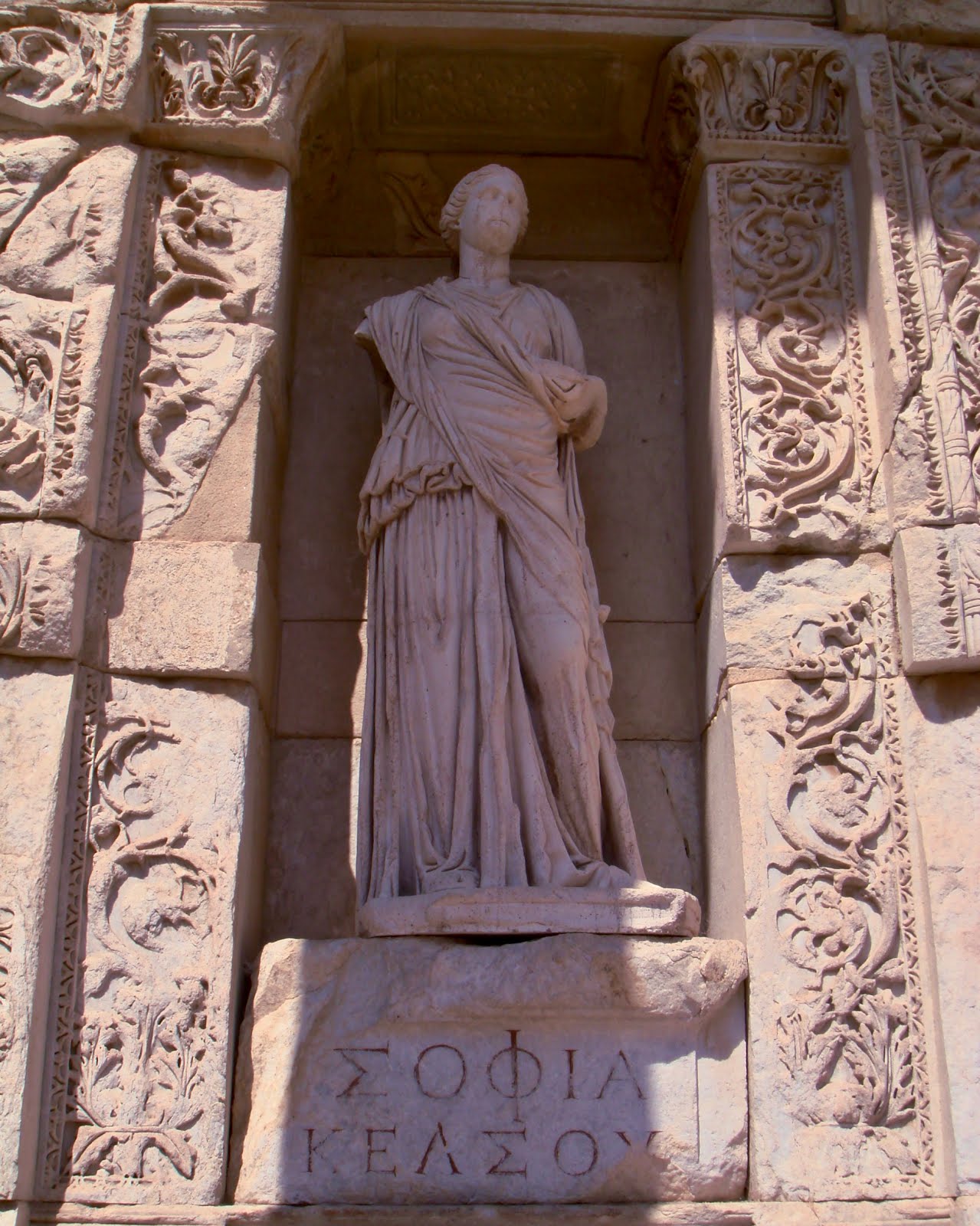 Τα αντίγραφα αγάλματα που κοσμούν τις κόγχες της πρόσοψης είναι η Έννοια, η Αρετή, η Σοφία και η Επιστήμη.