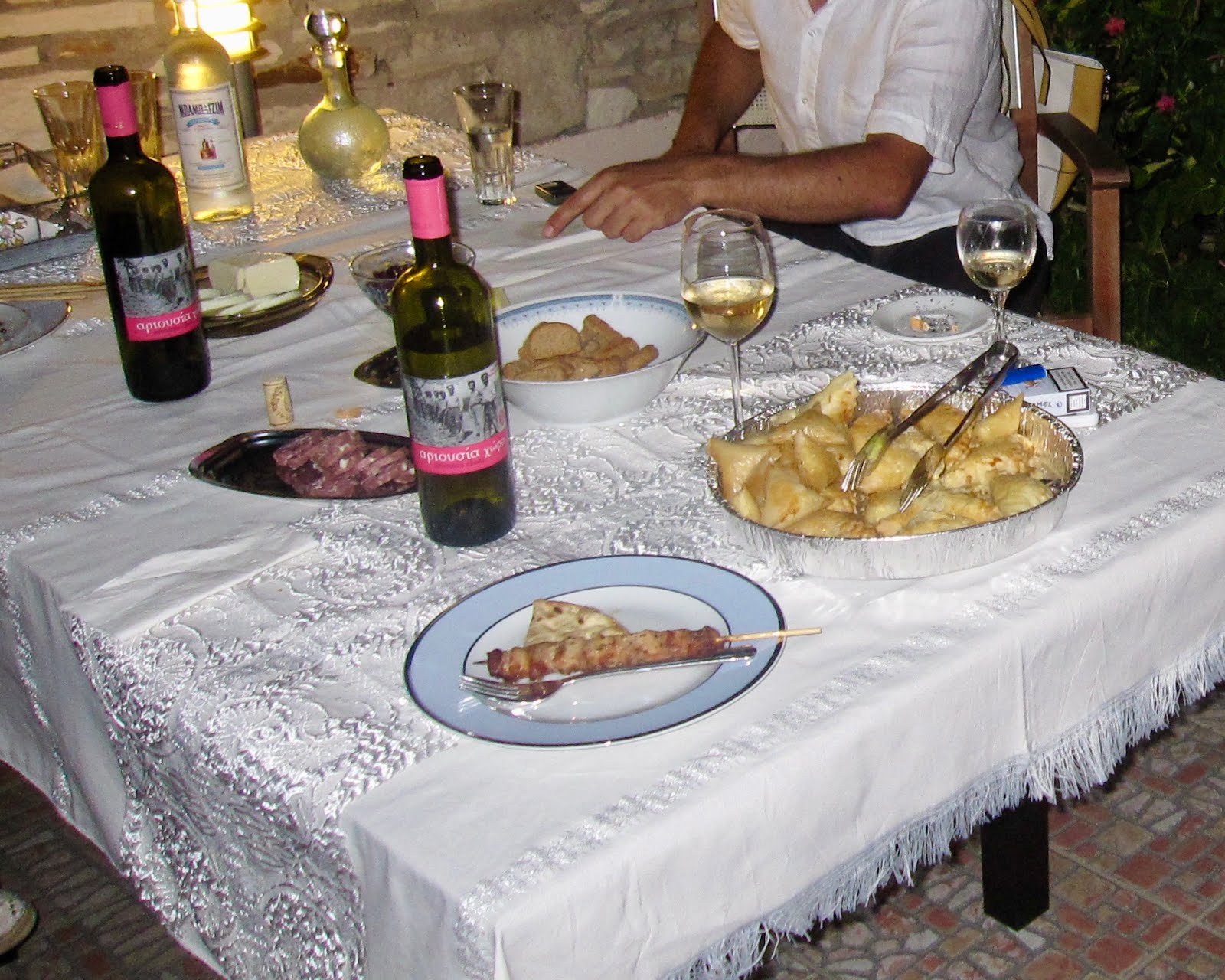 παρέα με τον τοπικό οίνο, ως επί το πλείστον, τον Αριούσιο Αυστηρό, ένας ερυθρός ξηρός (με ελκυστικό πορφυρό χρώμα και άρωμα κόκκινων φρούτων και βανίλιας με 13% Al) και βεβαίως, βεβαίως