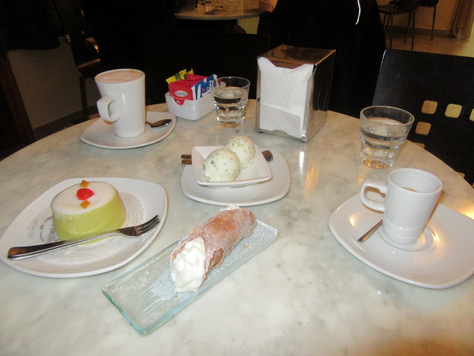 Έτσι, πήραμε ένα κανόλι, ένα κασάτο και ένα παγωτό με ρικότα και φυστίκι και καφέ καπουτσίνο φυσικά. Το κανόλι ήταν το καλύτερο απ’ όσα δοκίμασα στη Σικελία μέσα σε αυτό το τριήμερο. Το Caffè Sicilia μας φάνηκε αντάξιο της φήμης του.