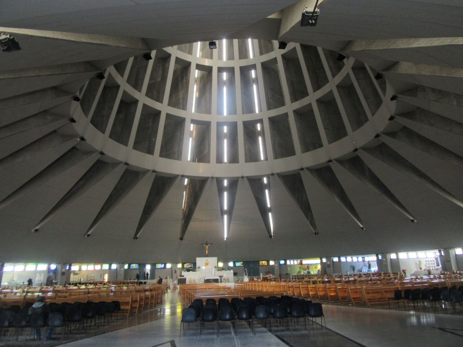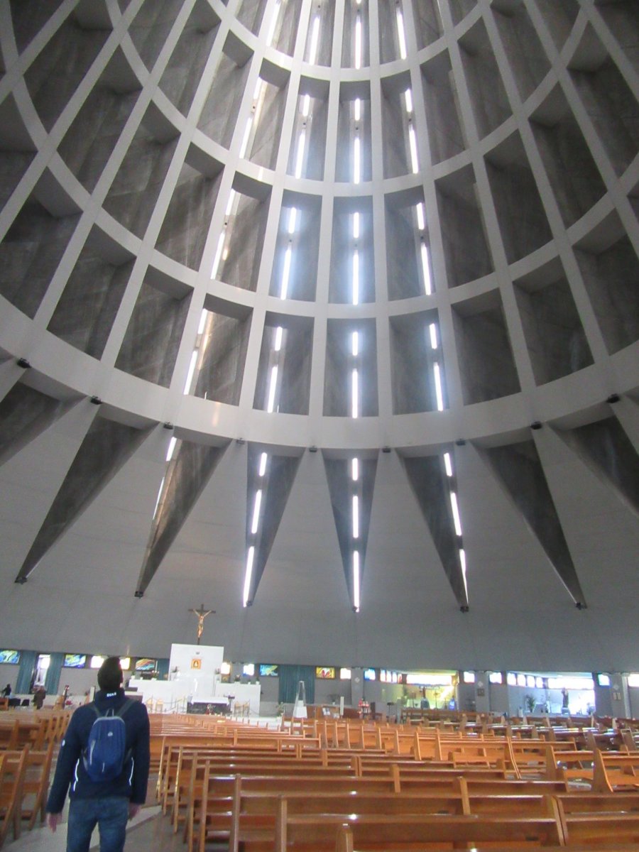 Είναι μοντέρνα και σαν σχέδιο και σαν κατασκευή. Το εσωτερικό της είναι πιο εντυπωσιακό απ’ ότι το εξωτερικό της. “Διαστημικό” φαίνεται το έξω, “διαστημικό” και το μέσα. Ή μάλλον σου θυμίζει περισσότερο μουσείο παρά εκκλησία. Είναι εντελώς μίνιμαλ, χωρίς αγάλματα και εικόνες. Η μόνη διακόσμηση είναι τα βιτρό στα παράθυρα, περιφερειακά, που αφήνουν να μπει ένα πλαϊνό φως. Και είναι και τεράστια.