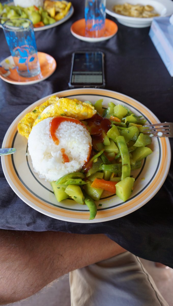 Το κατάλυμά μας θα είχε ρεύμα μόνο για τρεις ώρες, από τις 6 μέχρι τις 9 το βράδυ, κι αυτό από γεννήτρια. Κατεβήκαμε να φάμε μεσημεριανό, το οποίο βασικά ήταν λαχανικά και ελάχιστη πρωτεϊνη. Ένα από τα λαχανικά ήταν μια περίεργη πρασινίζουσα μίξη πιπεριάς και αγγουριού που μου άρεσε πολύ. Ο Κρεκούζας φυσικά που δεν αγγίζει ποτέ πρασινάδες και λαχανικά, έμεινε νηστικός τρώγοντας μόνο το ένα κομματάκι κοτόπουλο που μας έδωσαν και προς τιμήν τους οι άνθρωποι δεν τον χρέωσαν.