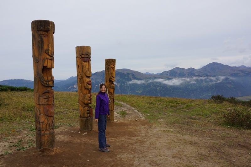 Κάπου εκεί, αφήνοντας το Viluchinsky στα αριστερά μας χωρίς να το δούμε, (παρά μόνο βγήκαμε φωτογραφίες με κάποια τοτέμ! ) εν μέσω χαμηλής νέφωσης και βροχής σταματήσαμε σ’ ένα σημείο από όπου θα πηγαίναμε υποτίθεται πεζοπορώντας σε θερμές πηγές. Εκεί γίναμε μάρτυρες ενός περιστατικού που μας υπενθύμισε, σε περίπτωση που το είχαμε ξεχάσει, τους κινδύνους του μέρους που βρισκόμασταν. Τρεις κοπέλες από ένα άλλο γκρουπ, μούσκεμα, παγωμένες και με λάθος σακίδια, κατόπιν λάθος συνεννόησης με τους οδηγούς τους, χωρίς φαγητό και νερό, έτυχε να βρεθούν από εμάς σ’ εκείνη την ερημική έκταση, μέσα σε πολύ κρύο και βροχή. Είχαν στήσει τις σκηνές τους σε λάθος σημείο, για το οποίο ο Valentin μας είχε πει ότι είναι εντάξει το καλοκαίρι, αλλά πλέον ήταν εκτεθειμένο σε ανέμους. Σαν αποτέλεσμα, τις πήρε και τις σήκωσε, κυριολεκτικά, μέσα στη νύχτα, όπως και τους υπόλοιπους της ομάδας τους. Εκεί που τις βρήκαμε υποτίθεται ότι τις είχαν αφήσει με άλλο όχημα, για να βρουν ζεστασιά σε παρακείμενο καταφύγιο, το οποίο όμως ήταν κλειστό. Σε μια τέτοια αφιλόξενη περιοχή, χωρίς επικοινωνίες, με κακοκαιρία και άγρια ζώα, ήταν απλά θέμα τύχης ότι περάσαμε εκείνη την ώρα και τις βρήκαμε. Ειδικά η μία, έτρεμε ολόκληρη, έδινε την εντύπωση ότι ήταν ένα βήμα πριν τα κρυοπαγήματα.
