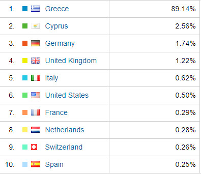 Η συντριπτική πλειοψηφία των επισκέψεων ήταν βεβαίως από την Ελλάδα, ενώ οι επόμενες χώρες ήταν η Κύπρος, η Γερμανία, το Ηνωμένο Βασίλειο, η Ιταλία και οι ΗΠΑ: