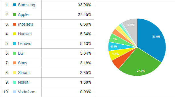 Από πλευράς μάρκας συσκευών, η Samsung και η Apple έχουν τις πρώτες δύο θέσεις, με μεγάλη διαφορά προς το παρόν από τους υπόλοιπους: