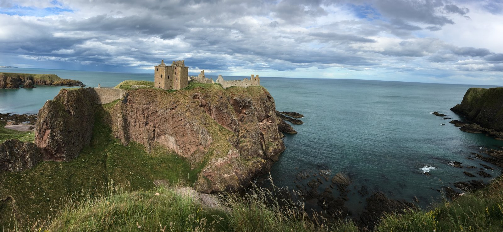 Πιο πρόσφατα, έβαλα στόχο να επισκεφθώ ένα κάστρο που είχα δει σε φωτογραφία (από αυτές που βγάζει όταν ανοίγουν τα Windows) και μου είχε κάνει μεγάλη εντύπωση. Λέγεται Dunnottar castle και βρίσκεται στον δρόμο για το Αμπερντίν. Φτάνοντας λοιπόν στο πάρκιν κατεβαίνεις μια πράσινη πλαγιά στο τέλος της οποίας γκρεμός στην Βόρεια θάλασσα. Κάποια στιγμή ξεπροβάλει ένας βράχος, αποκολλημένος από την υπόλοιπη στεριά, η κορυφή του οποίου είναι όλη κτισμένη. Οχυρό πάνω από την θάλασσα. Παρ’ ότι είναι αρκετά διαλυμένο, το δραματικό σκηνικό κόβει την ανάσα. Σκαλιά κατεβαίνουν στην παραλία με τα βότσαλα και τα μαύρα βράχια στην βάση του βράχου. Σκαλιά πάλι ανεβαίνουν από το απότομο μοναδικό πέρασμα μέχρι την πύλη. Ή μήπως δεν είναι το μοναδικό πέρασμα; Ανιχνεύοντας στην παραλία εντοπίζω δύο άλλα περάσματα, το ένα φραγμένο με κάγκελα. Και το άλλο οδηγεί σε μια στενή σπηλιά. Μέσα στο σκοτάδι δεν φαίνονται πολλά, όμως κάποια στιγμή διακόπτεται από ένα πεσμένο βράχο. Το ίδιο το κάστρο ήταν κλειστό όταν πήγα, αλλά η κατάσταση των ερειπίων μου έδωσε την εντύπωση ότι δεν έχασα και πολλά. Μια και είχα χρόνο, ακολούθησα την ακτή προς το γειτονικό ψαροχώρι Stonehaven. Περνώντας τις βοσκούσες αγελάδες ανέβηκα σε ένα λόφο με ένα παράξενο ελληνοπρεπές μνημείο. Μνημείο πολέμου τελικά. Από εκεί βλέπεις το πανόραμα τόσο του κάστρου όσο και του Stonehaven και των γύρω βοσκοτόπων. Μια από τις καλύτερες θέες στην Σκοτία, μην την χάσετε.
