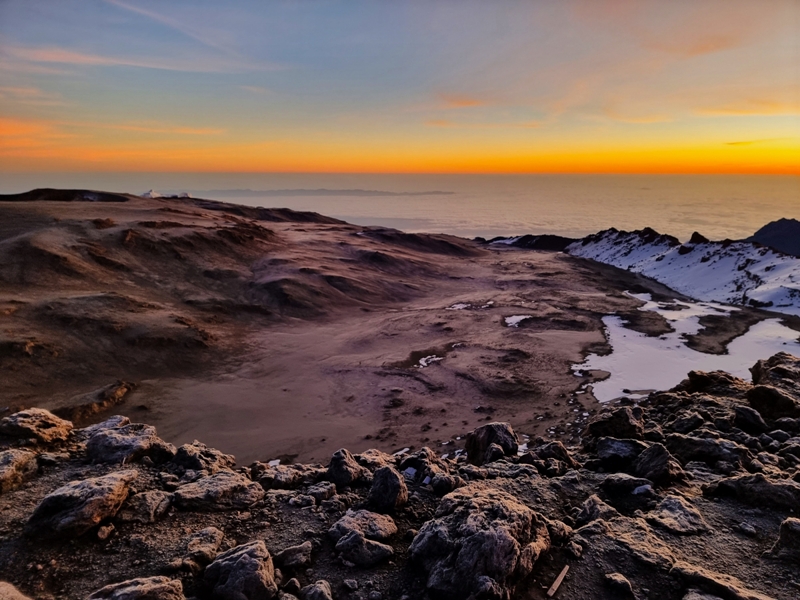 Εκεί χαμένοι μέσα στις σκέψεις μας, ξαφνικά βλέπουμε μία ταμπέλα μπροστά μας… Stella Point, Congratulations…5.756m. Το Stella Point σημαίνει το τέλος της μεγάλης ανηφόρας και το ότι είμαστε σχεδόν πάνω στον κρατήρα. Εδώ είναι και το σημείο για μία σοβαρή στάση. Βγαίνει το θερμός με το ζεματιστό τσάι τζιντζερ, και μπισκότα. Στο τελείωμα τους έχουμε ξεκινήσει τα καλαμπούρια. Πλέον η διαδρομή είναι περίπου 45 λεπτά μέχρι την κορυφή με μία πολύ μικρή κλίση.