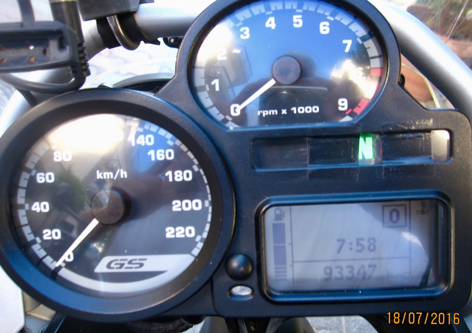 Κατά τις 7:58, με κέφι, γυρίζω την μἰζα της moto όπως φαίνεται στο φωτισμένο καντράν της και το κοντέρ της να δείχνει τα ήδη διανυθέντα χλμ, (τα περισσότερα εκ των οποίων ταξιδιωτικά).