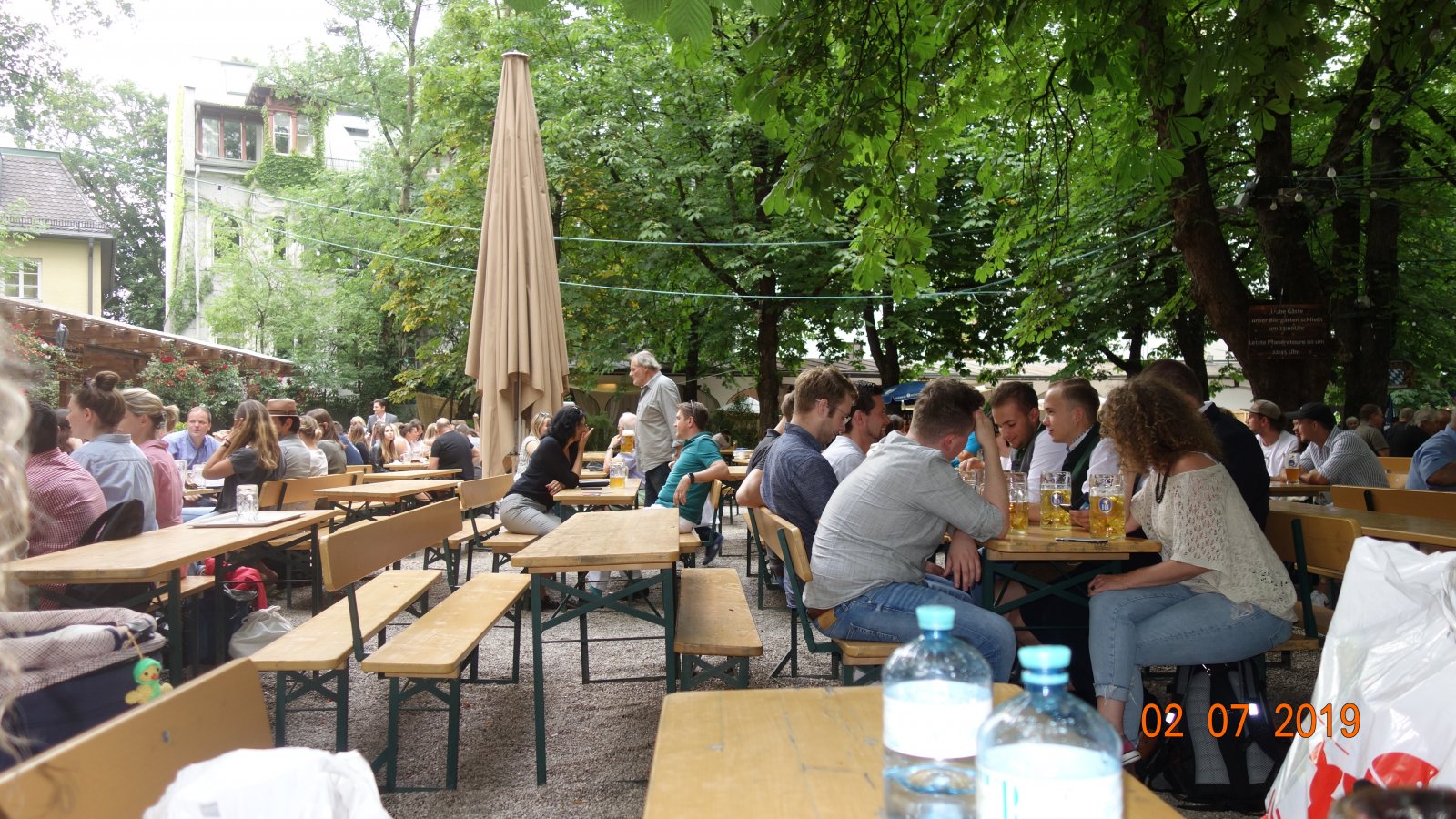 Με τίποτα ομως δε περίμενα αυτό που ειδα..ενας χώρος υπερβολικά τεράστιος,αν πω για 3.000 άτομα πιστέψτε με,δεν είναι υπερβολή...Με πολύ κόπο βρήκα παγκάκι για να κάτσω και πήρα τηλ την παρέα και έδωσα οδηγίες πως να με βρουν,να φανταστείτε οταν ήρθαν,όρθιος να κουνάω χέρια και να μη με βλέπουν!!Αφού εφοδιαστήκαμε με τις μπύρες λίτρου Αugustiner(όλες αυτές οι μπυραρίες-beer garden είναι self-service) απολαύσαμε τη βραδιά..