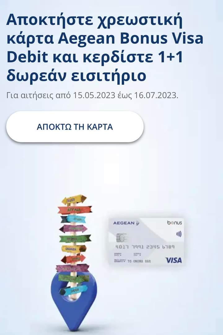 Εφαρμόζεται στο εισιτήριο του μέλους/κάτοχου της χρεωστικής κάρτας Aegean Bonus Visa Debit.