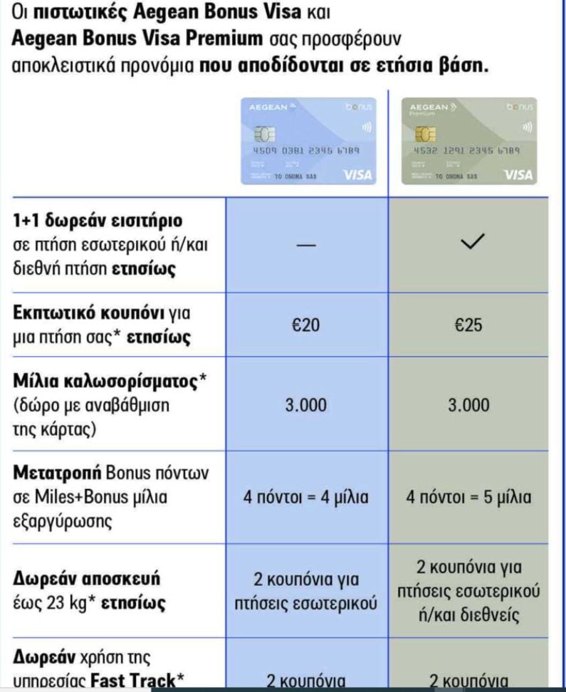 Δηλαδή αυτό που αναγράφει ακόμα και στο λογαριασμό του Μάιου της aegean visa δεν ισχύει; δύσκολο να το έχουν ξεχάσει θεωρώ γιατί το αναγράφει κάθε μήνα πλέον απλά πιθανόν να ισχύει μόνο για τις blue.Παλιότερα είχε βγει προσφορά για αναβάθμιση της παλιάς blue σε νέα blue ή premium. Ήθελαν να πουλήσουν κάρτες με συνδρομή. Πλέον δεν υπάρχει αυτό.