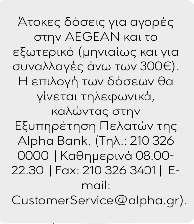 Τηλέφωνο στην alpha σήμερα η γυναίκα μου για να σπάσουμε μια αγορά της aegean σε 4 ατοκες. Mετά από ανάλυση του τι θέλουμε, απάντηση της υπαλλήλου θα πάρετε την aegean. Mα φωνάζω από μέσα η παροχή είναι της aegean bonus visa τι σχέση έχει η aegean, όχι από κει γίνεται.
