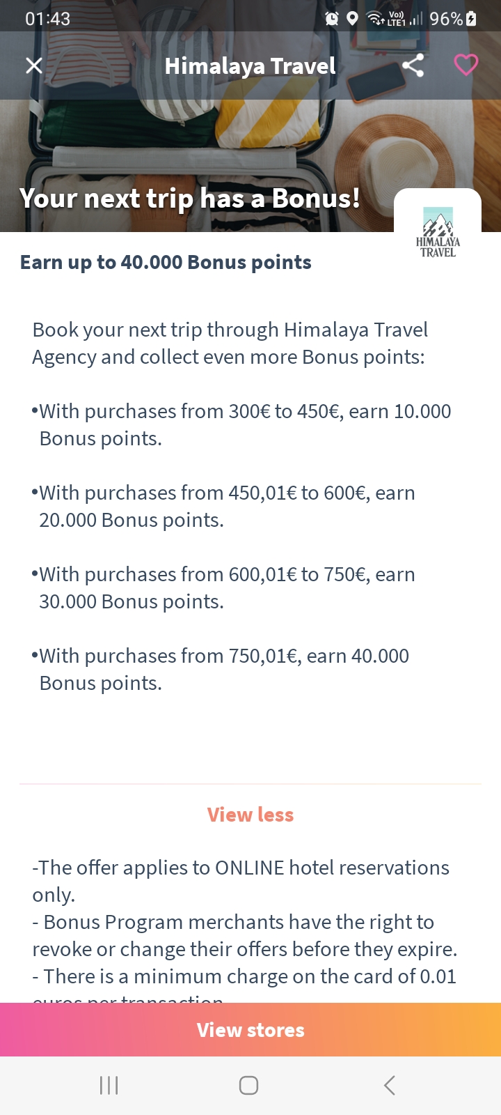Έχει ταξιδέψει κανείς με αυτό το πρακτορείο ή έκανε κρατήσεις σε ξενοδοχεία και πηγαν όλα καλα; Πρώτη φορά το ακούω και φαίνεται δελεαστική η προσφορά του!!Ισχυει αυτο απο το Himalaya travel οτι για πανω απο 300 ευρω σε ξενοδοχειο δινει 10.000 bonus? Γινονται μιλια αν πληρωσω με Aegean bonus visa?